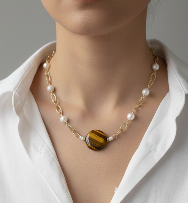 BALA est une pièce forte qui fusionne le charme intemporel des perles de culture avec la puissance d'une pierre naturelle centrale de caractère. Monté sur une chaîne à maillons élégante en acier inoxydable doré, ce collier court mettra parfaitement en valeur votre décolleté. Vous pouvez ajuster sa longueur en attachant le fermoir au maillon de votre choix.