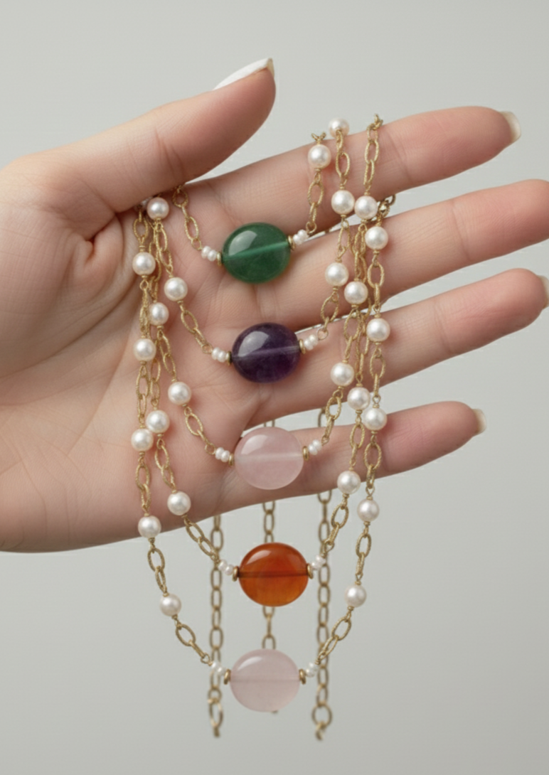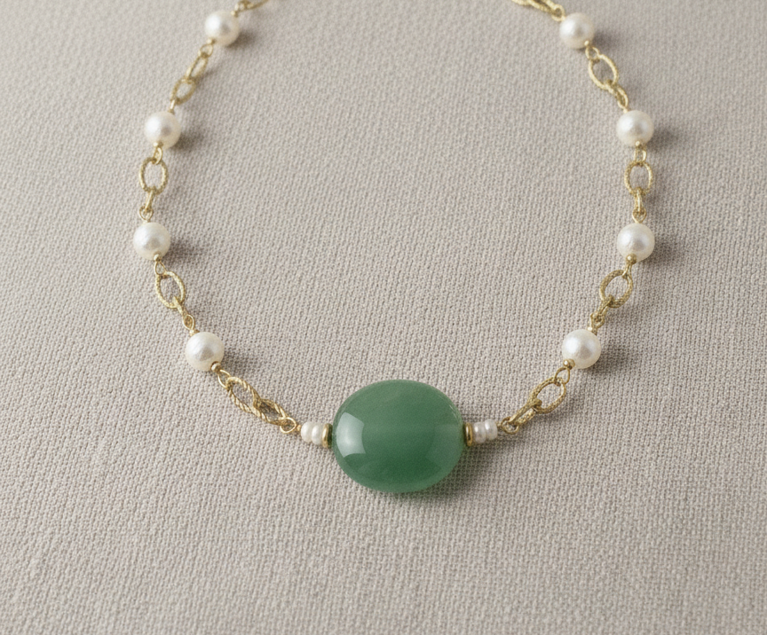 | Matériaux | Pierre Naturelle, Perles de Culture (Eau Douce), Acier Inoxydable Doré |