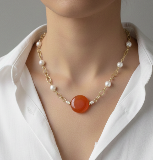 Pierre Naturelle Centrale : Une magnifique pierre ronde et polie (selon la couleur choisie : Cornaline pour l'orange, Œil de Tigre, Améthyste pour le violet, etc.) qui attire la lumière et confère une vibration unique au collier.