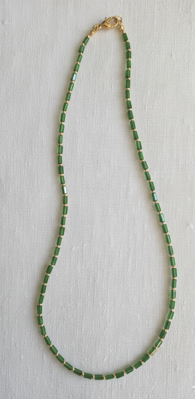 Petites perles d'espacement dorées, qui séparent et mettent en valeur les perles de verre, soulignant le côté précieux et durable du bijou.