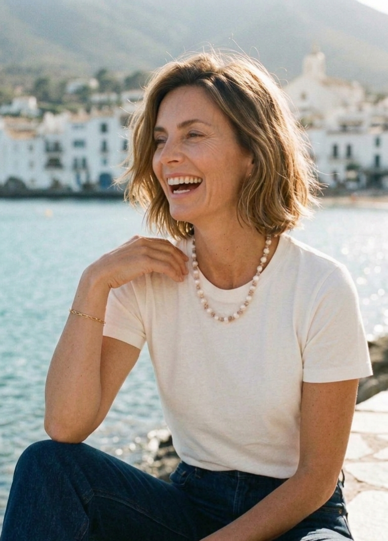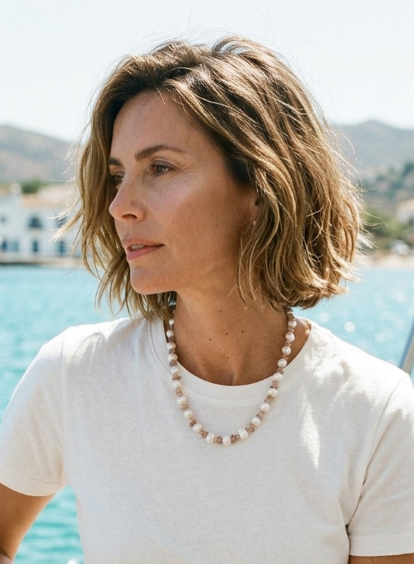 Rythmée par des nuances poudrées et des reflets irisés, cette composition évoque le va-et-vient apaisant des vagues. L’équilibre entre matière organique et pierre douce crée une silhouette lumineuse, à la fois naturelle et profondément élégante.