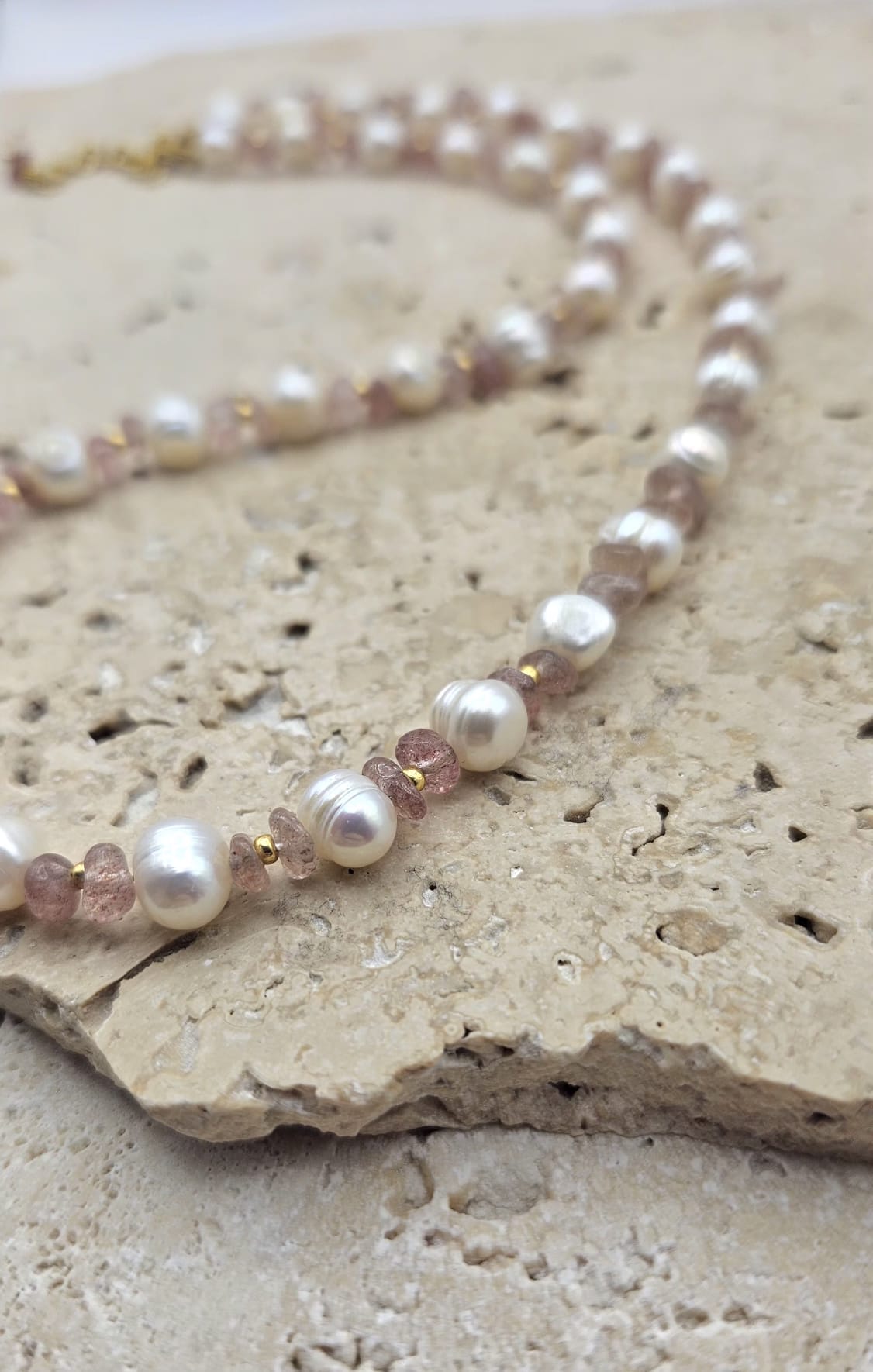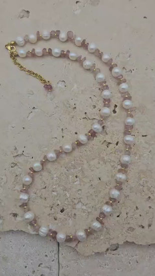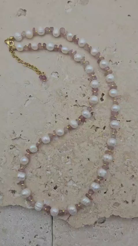 Matériaux : Perles de culture et quartz rose véritables.