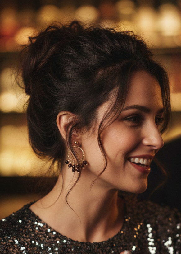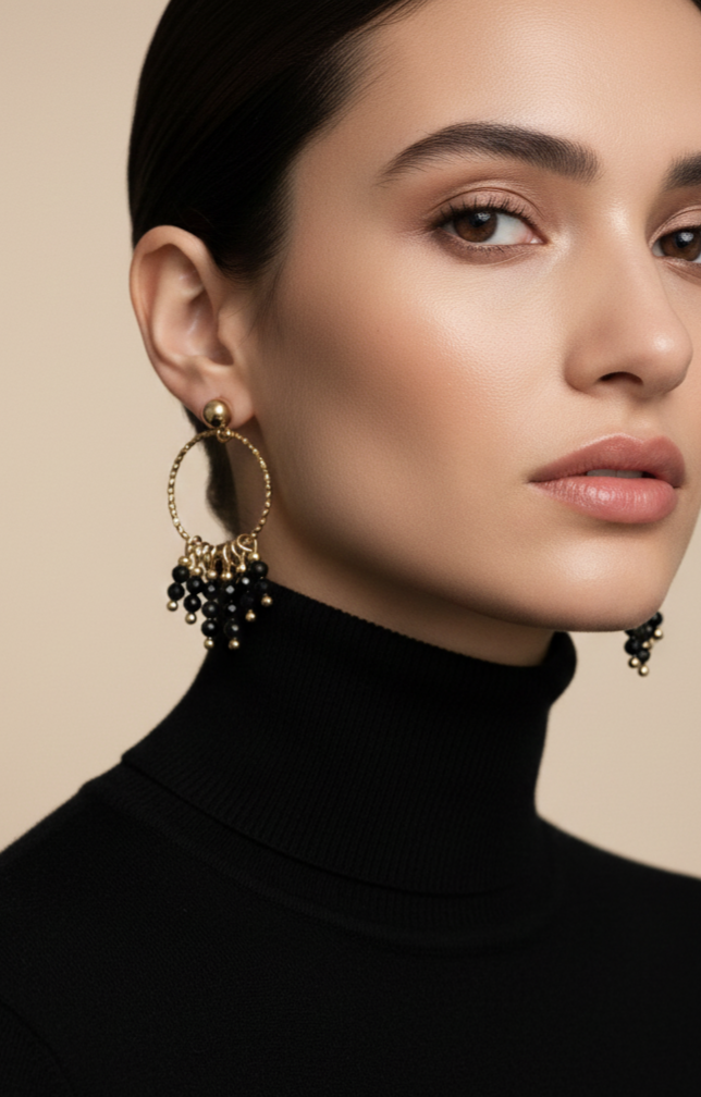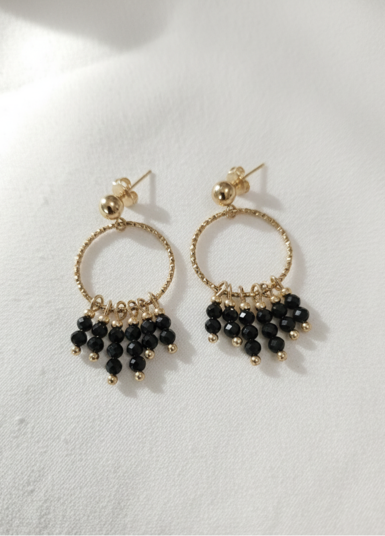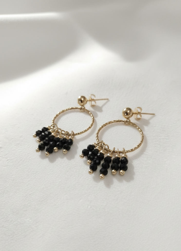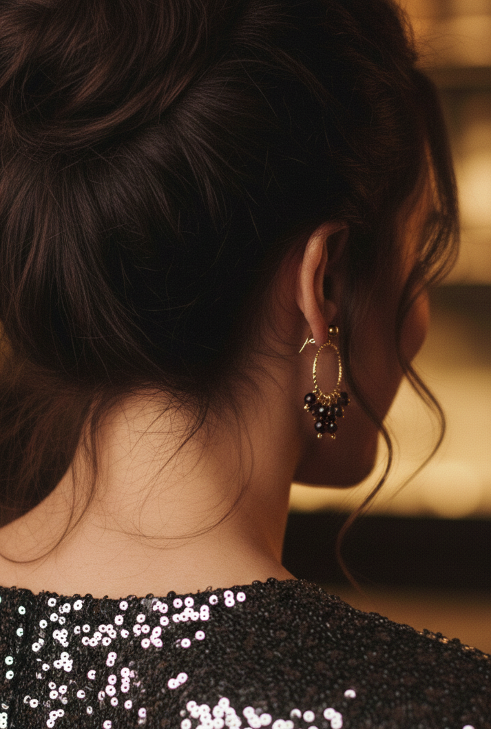 Design : Elles arborent un anneau texturée en acier inoxydable, d'où pendent de multiples grappes de grenats ou d'Onyx (version noire) facettés. Ce design chandelier offre un mouvement délicat et une brillance captivante.